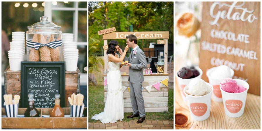 Это прекрасная альтернатива классическому «кенди» бару. Такие лакомства будут по вкусу всем гостям. Не лишним будет приготовить разнообразные топпинги, среди которых ягоды, шоколад, печенье, различное драже. Кроме того, вкусным мороженым можно заменить приторный свадебный торт. Можно подобрать свадебный наряды в цвете мороженого.