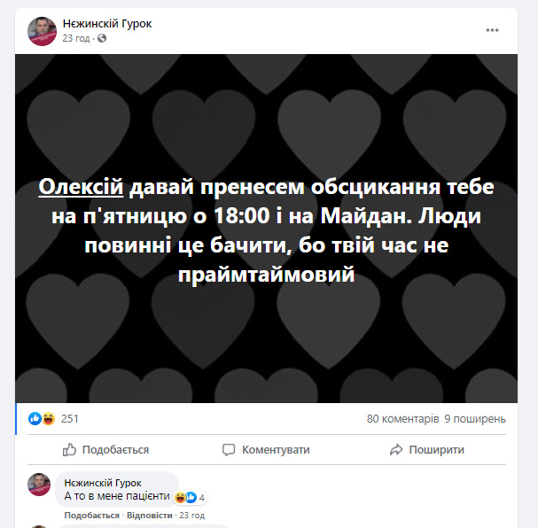 В своем посте мужчина указал, что не может встретиться с Арестовичем в назначенное ранее время — 11:00 понедельника, так как он работает врачом и на указанное время у него назначен прием пациентов. Кроме того, он предложил советнику Ермака провести встречу публично на Майдане.