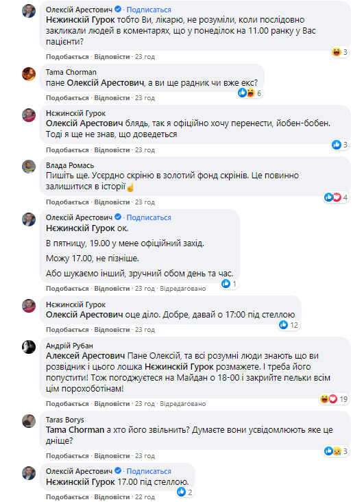 Советник главы Офиса президента Алексей Арестович договорился встретиться с пользователем, которого накануне оскорбил в соцсети. Об этом в Facebook написал пользователь Нєжинскій Гурок.