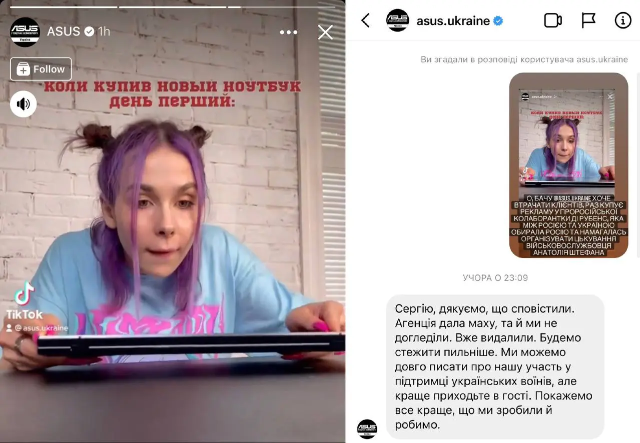 «Агентство дало маху, и мы не досмотрели. Уже удалили. Будем следить пристальнее. Мы можем долго писать о нашем участии в поддержке украинских воинов, но лучше приходите в гости. Покажем все лучшее, что мы сделали и делаем», — проинформировала Asus.