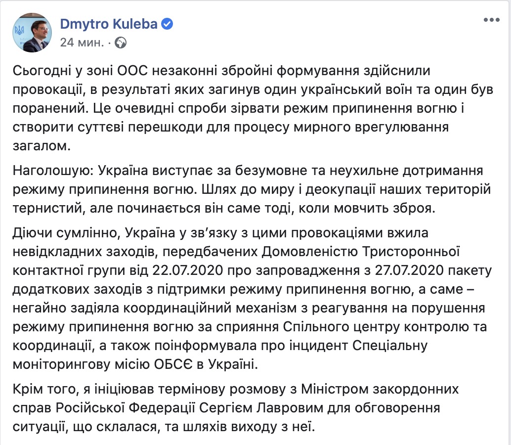 «Я инициировал срочный разговор с министром иностранных дел Российской Федерации Сергеем Лавровым для обсуждения сложившейся ситуации (на Донбассе – ред.) и путей выхода из нее», – написал Кулеба на своей странице в Фейсбуке в воскресенье вечером.