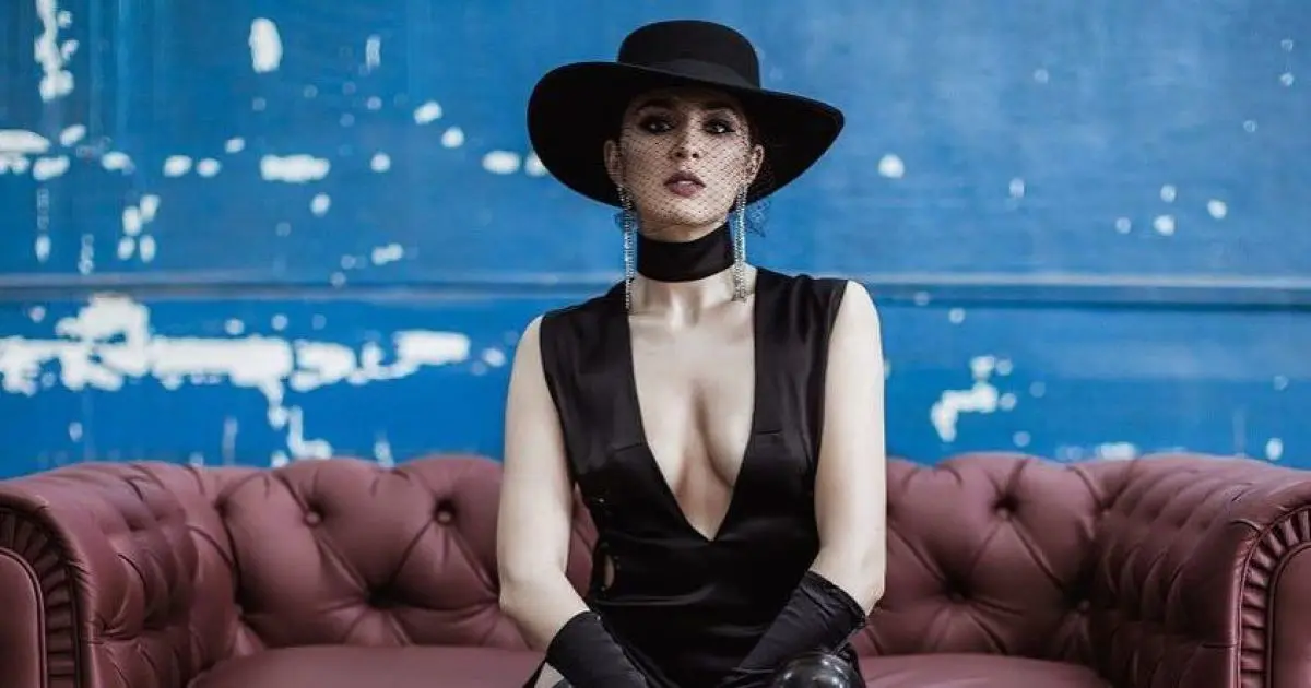 Артистка была одета в короткое черное платье с прозрачными вставками и очень глубоким декольте. Образ дополняли ботфорты, длинные черные перчатки и шляпа в тон.