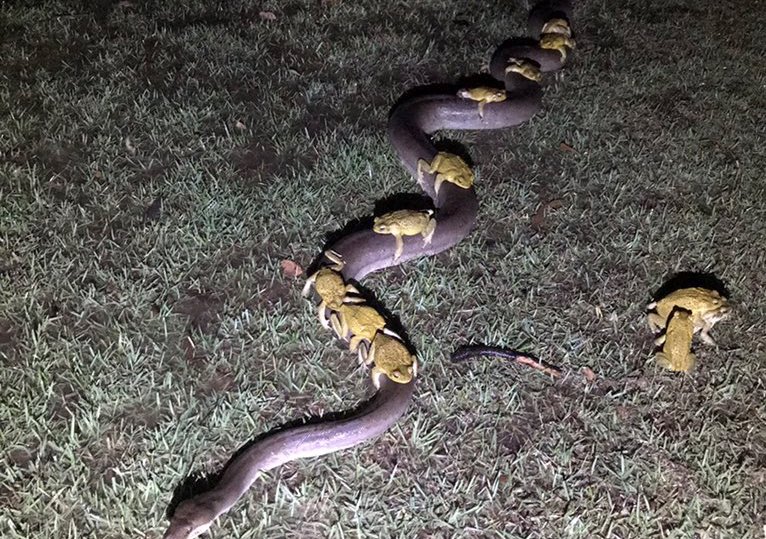 Однако зоологи рассказали причину поведения жаб: самцы тростниковой жабы пытаются не уехать, а совокупиться с 3,5-метровым питоном.