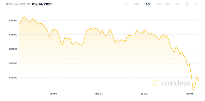 Это при том, что 2-3 января криптовалюта подорожала более чем на 4 тысячи долларов, достигнув стоимости в 34 366 долларов.