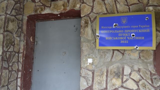 Ворота, двери КПП, табличка на входе вся в шаровых отверстиях. Боевики применяли автоматы и светошумовые гранаты. В руку ранен один солдат Национальной гвардии, но часть, не захвачена.