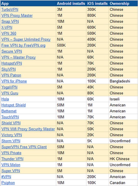 Так, 17 из 30 наиболее популярных VPN-приложений, как выяснили исследователи Top10VPN, имеют подтвержденные связи с Китаем. Часть из них принадлежит независимым разработчикам, а часть — студиям, в той или иной степени подконтрольным китайским властям.