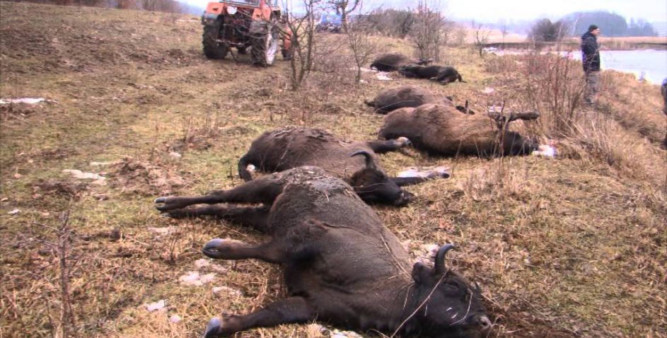 Как отметили защитники природы, трагедия произошла 31 января, когда несколько пьяных селян заметили стадо зубров. Животные в поисках пищи вышли из леса в поле.