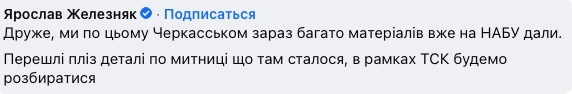 Народный депутат из парламентской фракции «Голос» Ярослав Железняк в комментариях к посту Бутусова написал, что по Черкасскому уже есть материалы в НАБУ.