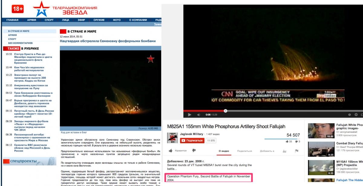 Так, сегодня, 12 июня 2014 года, российские СМИ распространили информацию о том, что украинские силовики якобы использовали фосфорные бомбы против мирного населения. В подтверждение этого телерадиокомпания Вооруженных Сил РФ «ЗВЕЗДА» использовала кадры, снятые в 2004 году в городе Эль-Фаллуджа, Ирак. В распоряжении Центра АТО есть копия видеосьемки в Ираке. Кроме этого, в течении последнего времени, российские СМИ сообщали о якобы имеющихся фактах применения украинскими войсками против мирного населения систем залпового огня «Град».