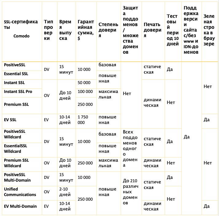 Как мы уже говорили выше, сертификатов Comodo SSL имеется огромное множество. На примере вышеупомянутого посредника SSL.com.ua рассмотрим подробнее характеристики каждого SSL-сертификата, предлагаемого Comodo.
