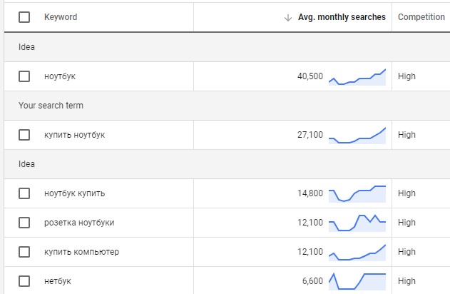 Пример частотности запроса “купить ноутбук” в Keyword Planner