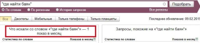 Потому продвигаться стоит низкочастотными запросами, по которым только 1-5 человек в месяц ищут ваш товар в интернете, и ваши конкуренты даже продвигаться по таким запросам не подумают. Например, если мы забьем в том же вордстате фразу «где найти баян», то увидим, что 1 человек в месяц ищет баян по данному запросу:
