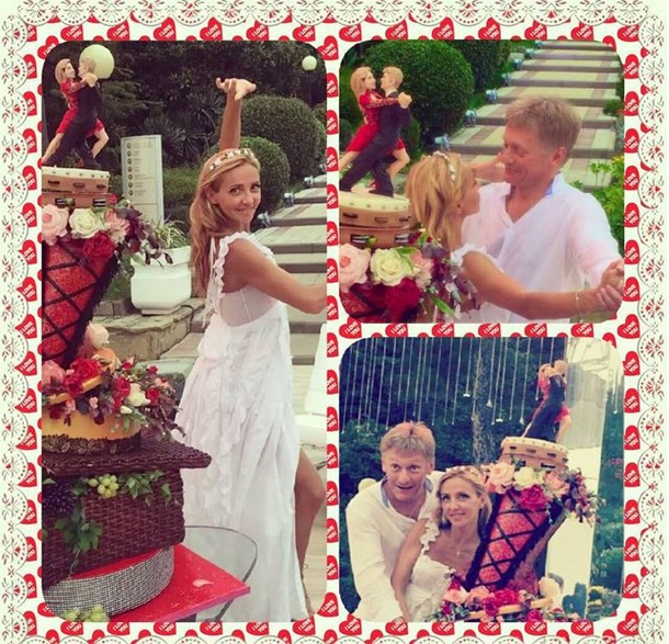 В Интернете появилось фото огромных размеров торта со свадьбы пресс-секретаря президента России Владимира Путина Дмитрия Пескова и Татьяны Навки.