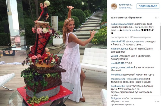 «Сказочный торт нашей принцессы», – подписала снимок торта Рудковская. Фото торта огромных размеров и интересного дизайна сделано на второй день свадьбы. Необычное кондитерское изделие вызвало массу комментариев подписчиков Рудковской и пользователей соцсетей.