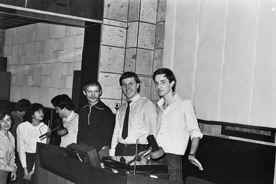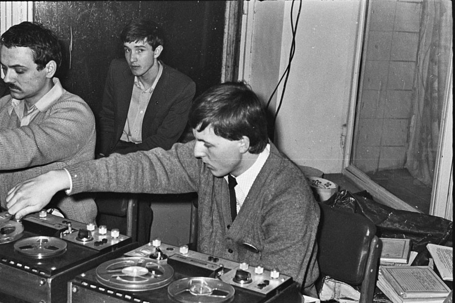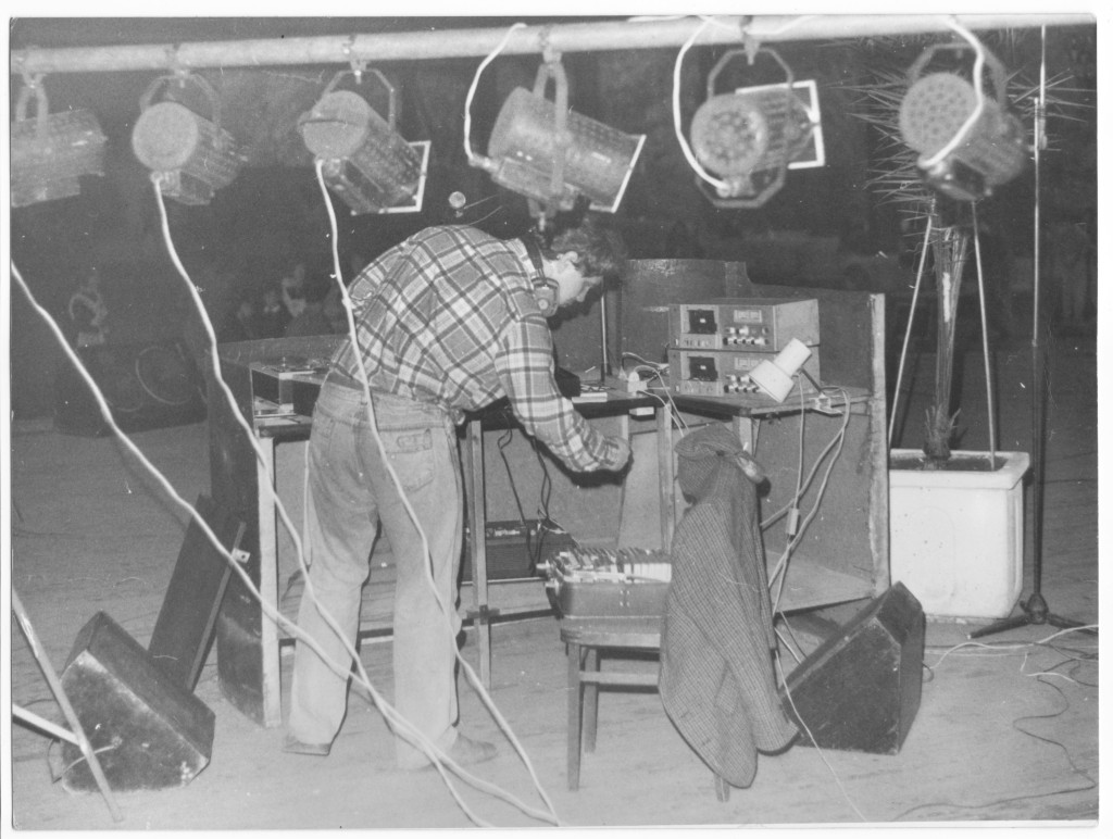 05. А вот очень крутой фотоснимок рабочего места хорошо упакованного диск-жокея тех лет. На столе можно увидеть два бобинных магнитофона (скорее всего, что-то типа «Сатурна», «Астры» или «Маяка»), на столе справа — две кассетные магнитолы, что-то типа «Вильма-102 стерео» — как их тогда называли «магнитофон-приставка». Что стоит в чемоданном корпусе на стуле я не знаю, но предположу, что это пульт управления светом — вот теми самыми развешанными штанге прожекторами)