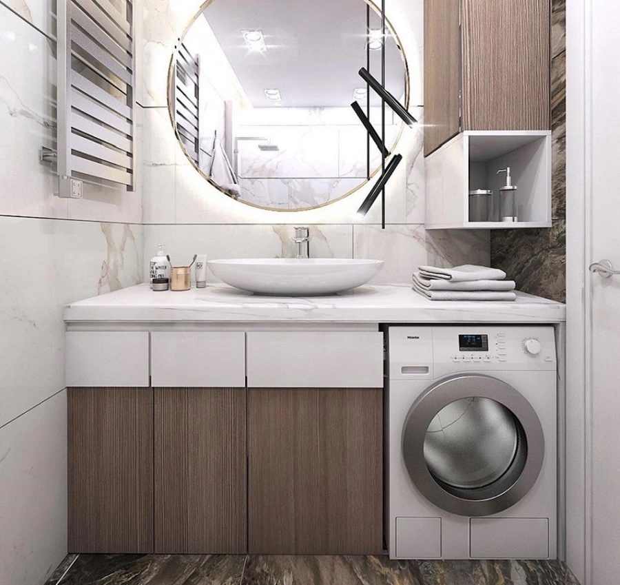 Если стиральная машина устанавливается в ванной, а не в отдельном помещении, то следует позаботиться о ее расположении. Обычно она занимает в комнате много места, а мы невольно привыкаем ставить на неё что-то сверху. Поэтому отличной идеей будет спрятать ее под столешницу или раковину. Помимо того, что такой вариант значительно экономит пространство, так это еще выглядит – оригинально и современно.