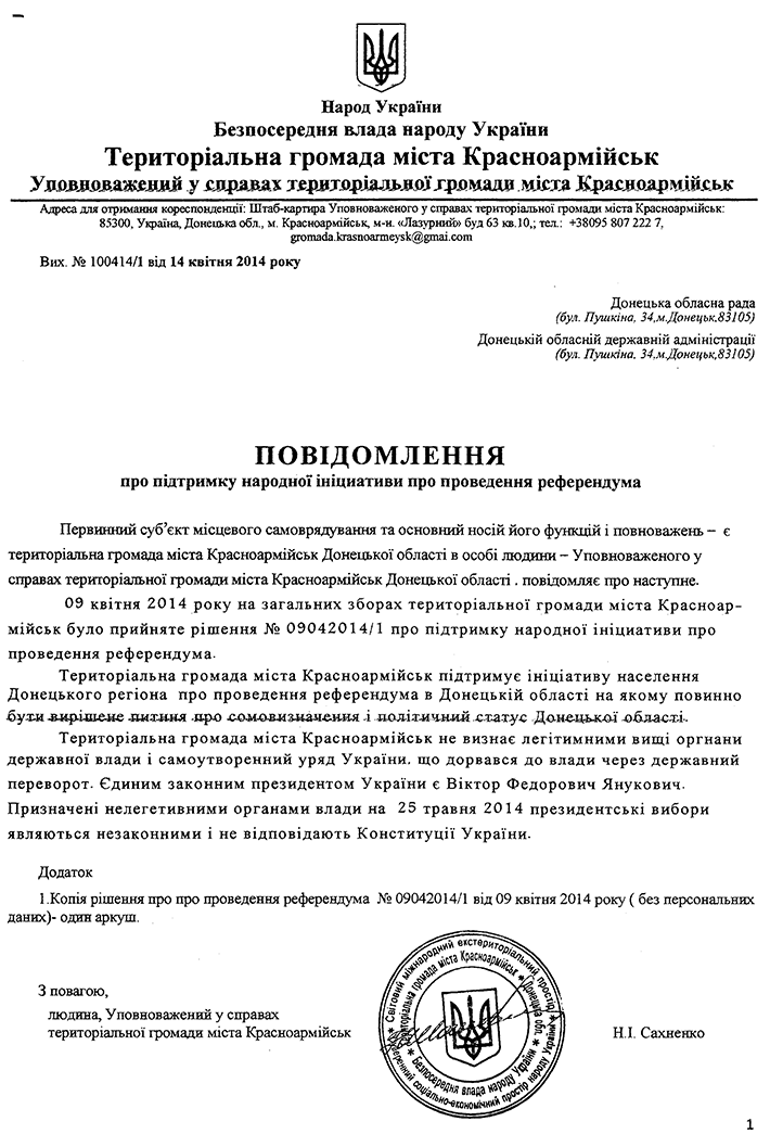 Руководство «Донецкой республики заверяет, что некая не предусмотренная Конституцией Украины «общественность города Красноармейска Донецкой области официально подтвердила тот факт, что поддерживает инициативу проведения референдума о дальнейшем статусе региона», Об этом говорится в документе, подписанном человеком с несуществующей должностью Уполномоченного по делам территориальной общественности города Красноармейска.