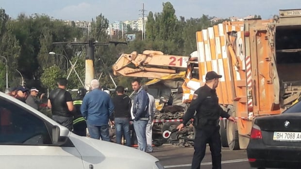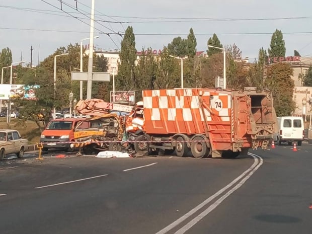 По сообщениям очевидцев, мусоровоз выехал на встречку и врезался в автовышку, в результате чего последняя фактически была раздавлена.