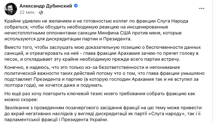 Народный депутат от «Слуги народа» Александр Дубинский настаивает на немедленном проведении заседания фракции для рассмотрения вопроса введения против него санкций США. Об этом Дубинский написал в Facebook.