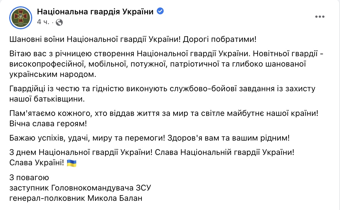 На странице в facebook опубликовано поздравление Николая Балана с годовщиной создания НГУ, где его подписали, как заместителя Главнокомандующего ВСУ.