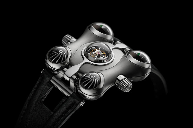 Футуристичные часы мгновенно приковывают внимание четырьмя сапфировыми куполами, в двух из которых вращаются индикаторы часов и минут, сделанные из цельного шарообразного пласта алюминия не толще листа бумаги. В оставшейся паре — сферические турбины, предназначенные для того, чтобы регулировать работу заводного механизма и защищать его от износа.