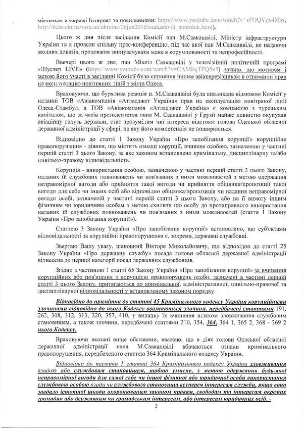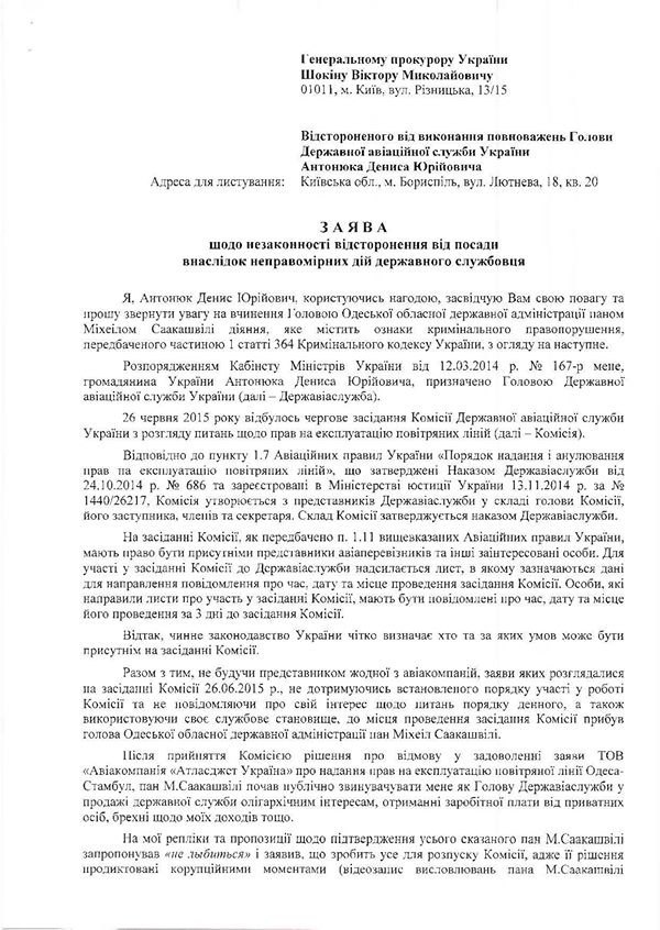 В документе Антонюк просит проверить Саакашвили на наличие коррупционных мотивов. По мнению Антонюка, одесский губернатор лоббирует интересы авиакомпании Atlas Jet.