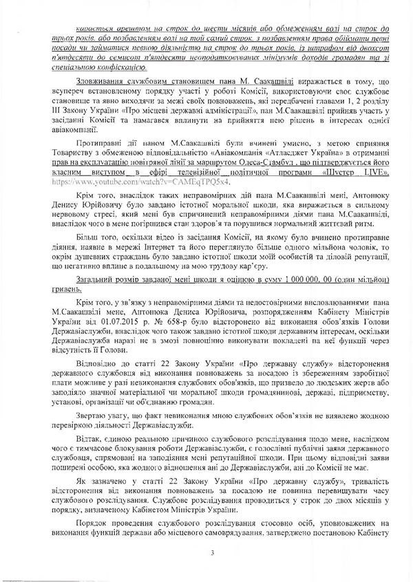 Глава Госавиаслужбы пишет, что Саакашвили не имел права приходить на заседание комиссии службы, и отмечает, что одесский губернатор в ходе перепалки предложил ему «не лыбиться». Антонюк оценивает ущерб, причиненный ему в результате перепалки с Саакашвили, в 1 млн гривен.