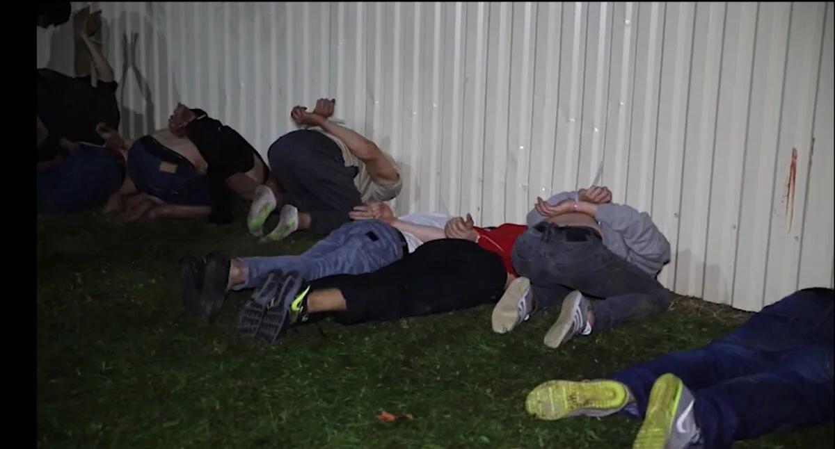 Один из мужчин сказал, что приехал в Минск на отдых в санаторий «Журавушка». Другой задержанный заявил, что имеет 12 судимостей, но не уточнил, откуда он родом. Крупным планом показаны татуировки у некоторых мужчин.