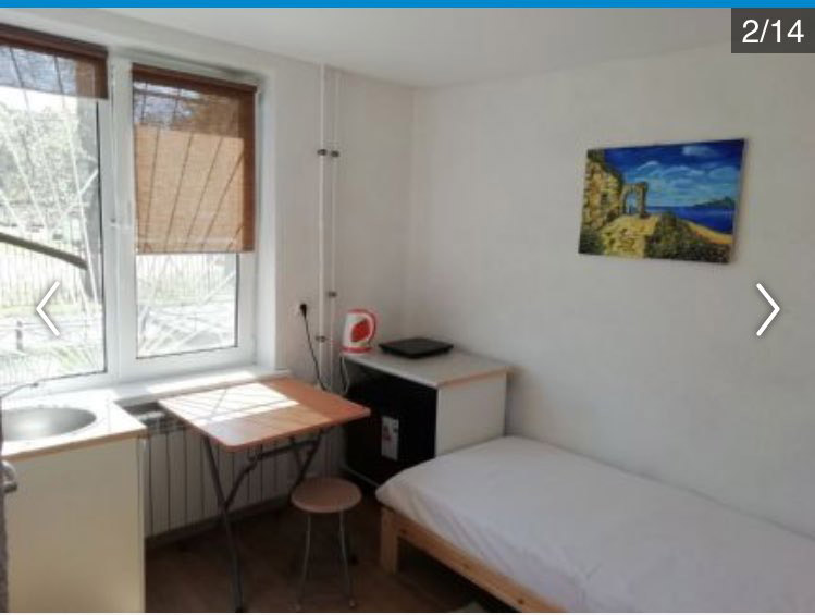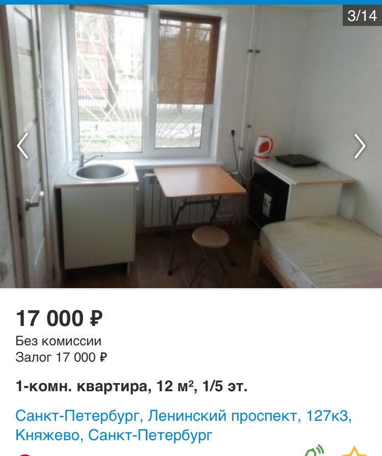 Вот как выглядит объявление о сдаче в аренду одной из таких квартир в Санкт-Петербурге. Квартира общей площадью 12 метров, находится на первом этаже пятиэтажного дома, арендная плата в месяц составляет 17 тысяч рублей. На фото можно увидеть маленькую односпальную кровать, что-то типа микроскопического кухонного столика с плиткой и чайником, раковину, а также маленький складной стол и табуретку.