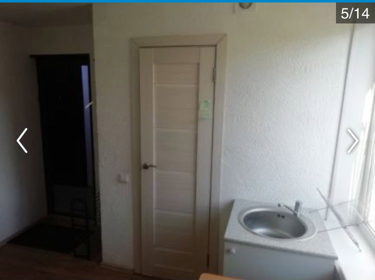 Повернём камеру влево — на этом снимке можно увидеть ту самую кухонную раковину, а за дешевой дверью в центре кадра располагается скорее всего туалет с душевой, отъёдая от и так микроскопического помещения где-то 3-4 квадратных метра. Итого жилая площадь комнаты не превышает 8-9 метров.