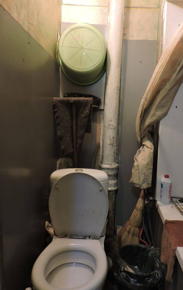 А это квартирный туалет. Если вы выложите миллион и ещё двести пятьдесят тысяч — то вам достанется деревянная швабра с измочаленной онучей, проржавевший стояк канализации и пластмассовый тазик оливкового цвета. Стоит задуматься.