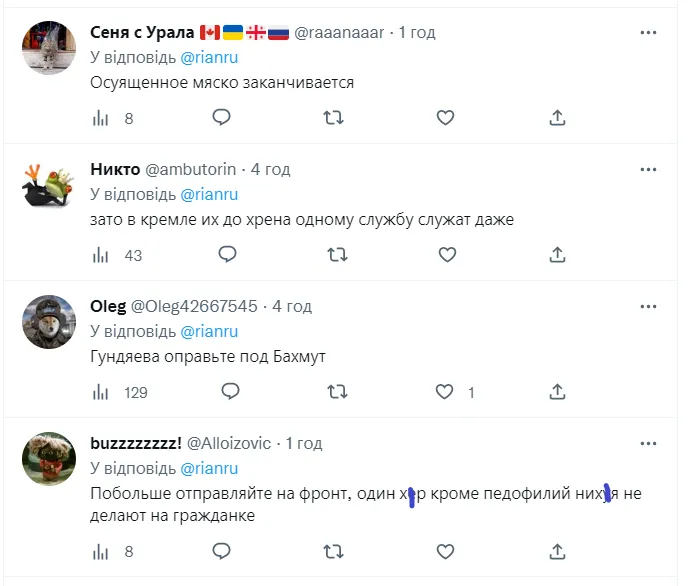 «Освященное мяско заканчивается», «зато в Кремле их до хрена, одному службу служат даже», «Гундяева оправьте под Бахмут», «Побольше отправляйте на фронт, один х*р кроме педофилий них*я не делают на гражданке», «Действительно, надо их побольше. Такой шанс предстать пред создателем», «Для этого есть замполиты. Или священников не хватает для отпевания?» — строят предположения комментаторы.