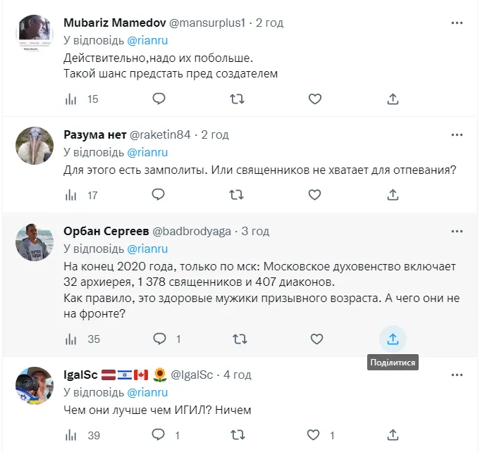 «На конец 2020 года, только по мск: Московское духовенство включает 32 архиерея, 1 378 священников и 407 диаконов. Как правило, это здоровые мужики призывного возраста. А чего они не на фронте?», «Чем они лучше, чем ИГИЛ?», «РИА Новости: «В РПЦ заявили о недостатке военных священников на фронте» Не успевают отпевать убитых», «Это шутка???», «У вас что-то есть в достатке на фронте?» — интересуются подписчики.