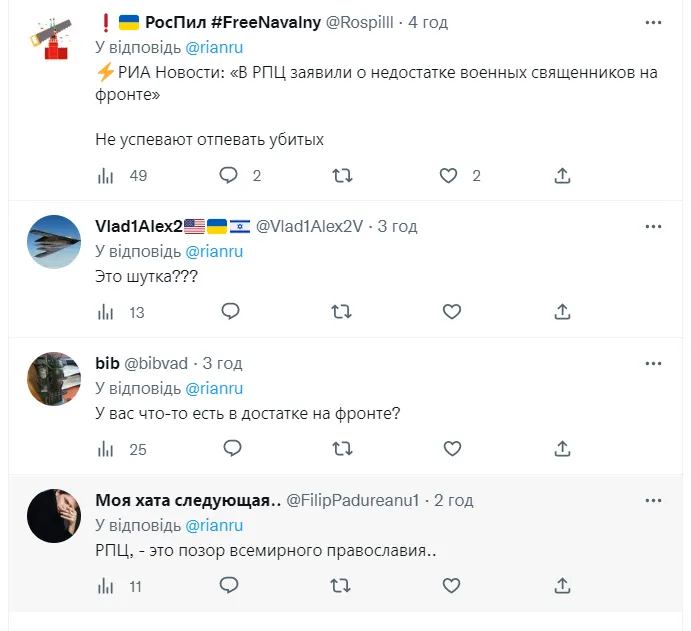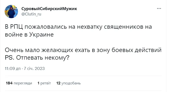 «В РПЦ пожаловались на нехватку священников на войне в Украине Очень мало желающих ехать в зону боевых действий PS. Отпевать некому?» — пишет пользователь Twitter под ником «Суровый сибирский мужик».