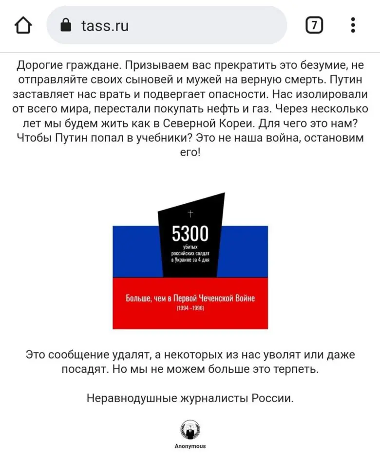 Хакерская группа Anonymous взломала сайты крупнейших российских изданий. Атака затронула такие пропагандистские СМИ, как ТАСС, «Коммерсант», «Известия».