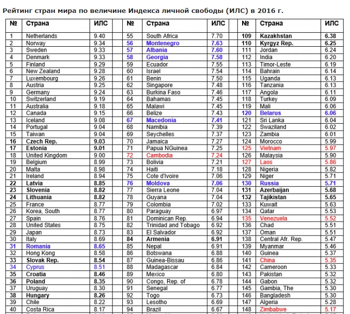 В связи с интересом к Индексу личной свободы, проявленным в обсуждении одного из предыдущих постов, полагаю возможным разместить ниже весь список стран мира по этому показателю.