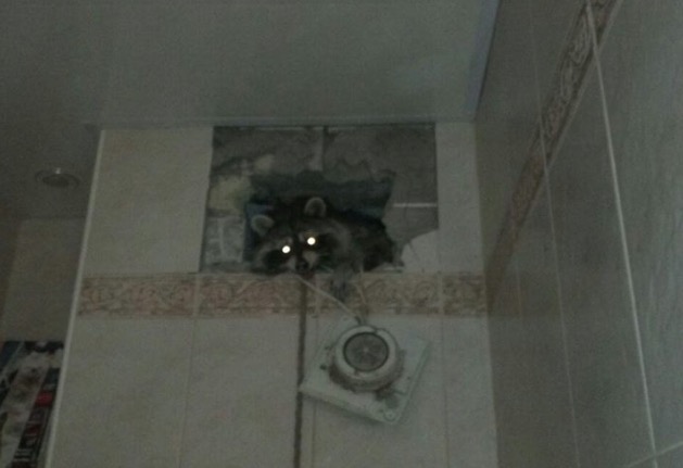 Отмечается, что енот был напуган переездом в новый дом и попытался спрятаться сначала в сантехническом люке для обслуживания труб, а затем в вентиляции.