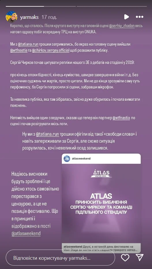 Впоследствии, после публичного резонанса, в инстаграме Atlas Festival появилось сообщение с официальными извинениями.