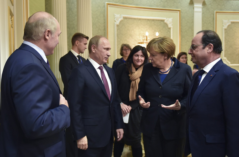 Переговоры президентов Украины Петра Порошенко, Франции Франсуа Олланда, России Владимира Путина и канцлера Германии Ангелы Меркель в Минске продолжились в расширенном формате.