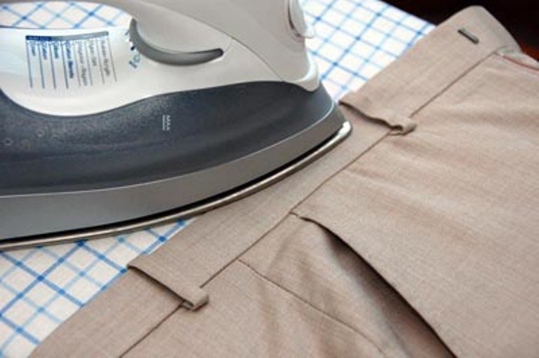 • Прогладить брюки возле карманов, снизу, по всей длине. То же самое проделать с обратной стороны.