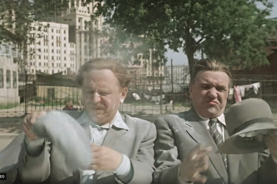 Всё внимание зрителей в этом эпизоде приковано к главным героям, которые активно очищают шляпы и костюмы от строительной пыли и сухого цемента — и поэтому на фон внимания не обращают. Думаю, примерно по тем же причинам его проморгала и цензура — которая требовала показывать Москву исключительно пафосной и величественной столицей. А между тем, сталинская Москва по большому счёту как-то так и выглядела.