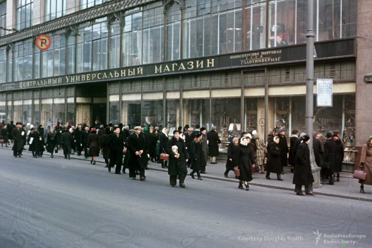 А теперь давайте посмотрим на реальные карды Москвы самого начала 1950-х годов. В те годы в Москве побывал майор американской армии Мартин Манхоф, который был помощником военного атташе в американском посольстве. Особенно ценны снимки тем, что Мартин снимал не пафосные проспекты, а реальную повседневную жизнь Москвы тех лет — подборку его фотоснимков недавно опубликовал портал «Настоящее время». Давайте посмотрим на них и мы.
