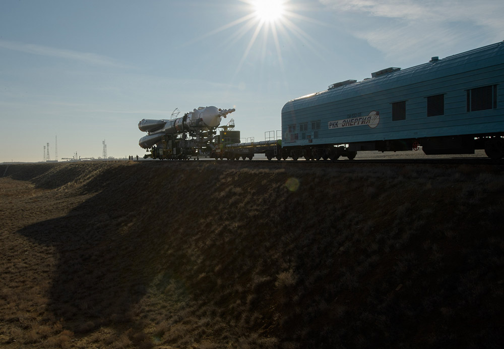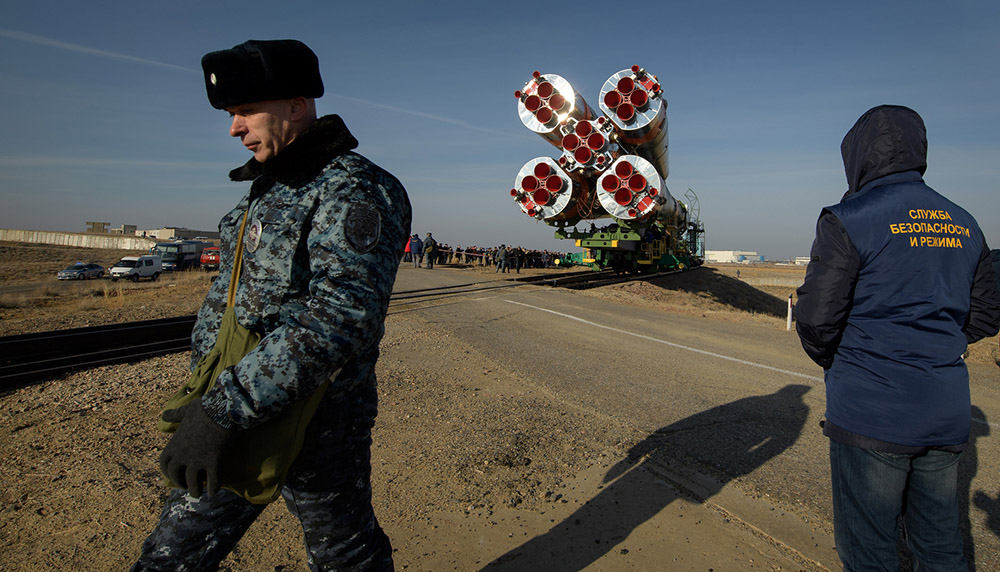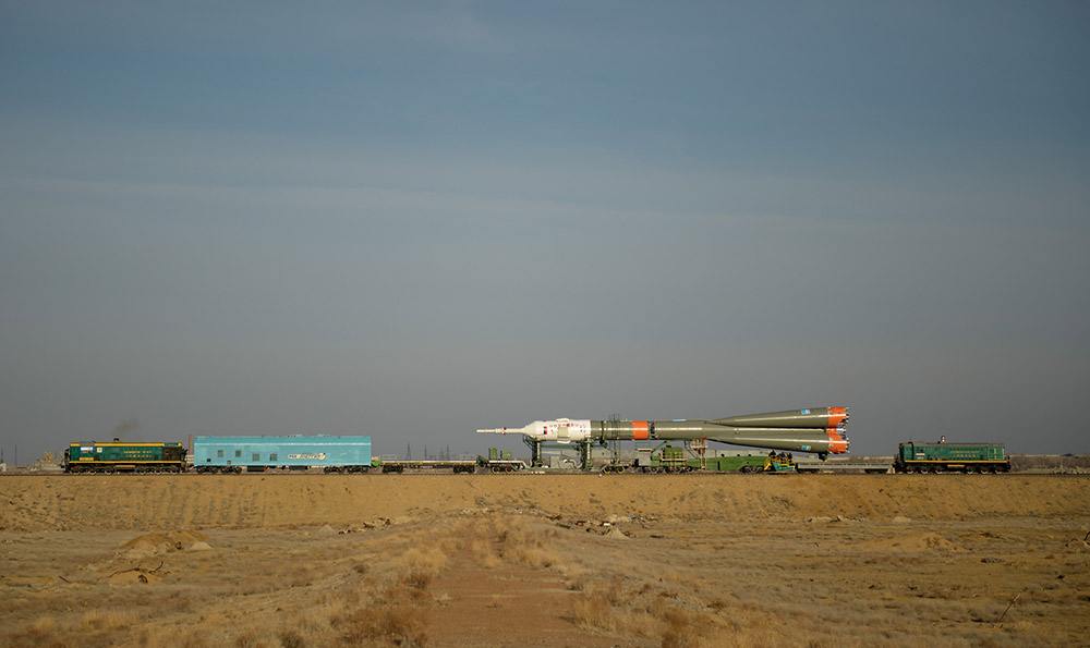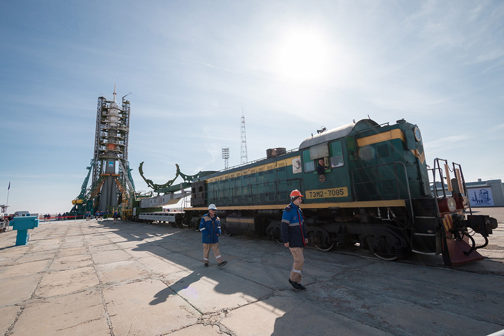 Собственно, вот так выглядит транспортировка корабля «Союз» к месту старта. Если вы думаете, что космодром «Байконур» это какие-то сверкающие космические площадки, как в нигах Айзека Азимова и Артура Кларка, то я вас разочарую — на самом деле это вот такие уныле кахахстанские степи.