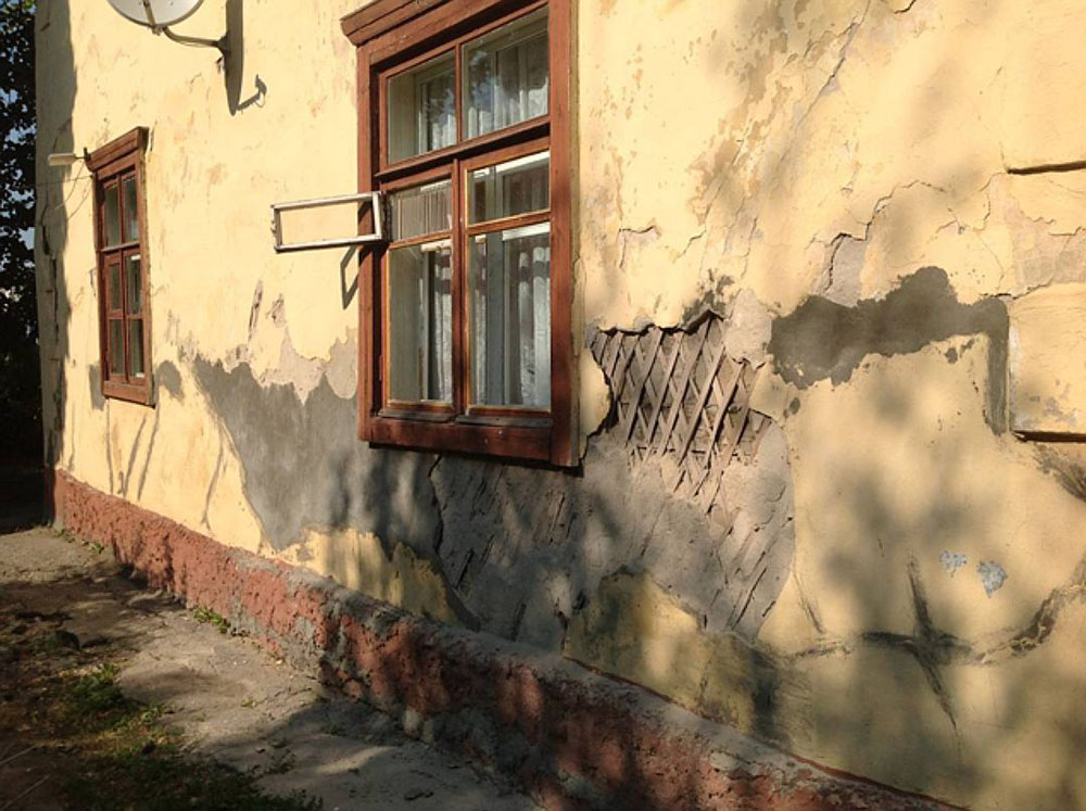 Внешние стены бараков как правило были деревянными. Иногда в местах с повышенной влажностью и ветрами внешние стены могли отделать штукатуркой, в этом случае задействовались те же технологии, что и при внутренней отделке помещений — на деревянные стены крест-накрест набивали «дранку», которую в свою очередь замазывали штукатуркой. Вот пример такой отделки фасада — под отвалившимися кусками штукатурки можно хорошо разглядеть весь технологический процесс: