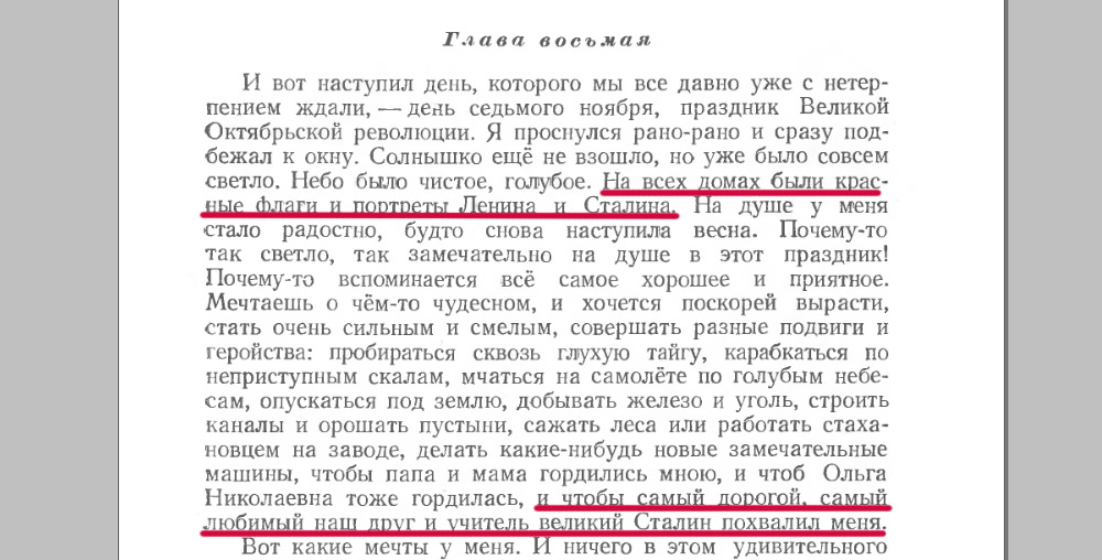 Уже позже, когда Носов стал писателем, он уже вполне конкретно пел в своих книгах дифирамбы Сталину — и вот одно из доказательств этого. На скриншоте — текст известной всем вам повести Носова «Витя Малеев в школе и дома» — думаю, вы все читали эту повесть, но читали её уже после цензурных правок, которые были внесены во все издания после 1956 года. А в старых изданиях Носов беззастенчиво хвалил Сталина, расписывая на целые абзацы оды вождю, в моей книге 1953 года это выглядело вот так: