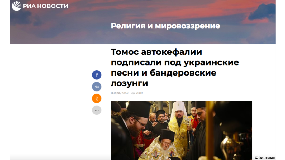 Издание РИА Новости» не отстает в истерики и выпускает материал о получении томоса под названием: «Томос автокефалии подписали под украинские песни и бандеровские лозунги». В материале говорится традиционная для прокремлевской пропаганды риторика о «расколе церкви», «трагический день для мирового православия» и «неканоничность». Журналисты рассказывают, будто в перерыве между утренним молебном и подписанием томоса гости активно фотографировались и тихонько говорили «Слава Украине!». И в принципе, если учесть количество украинцев, которые пришли принять участие в историческом для украинского православия события, то действительно такое украинское поздравление могло звучать в Стамбуле.