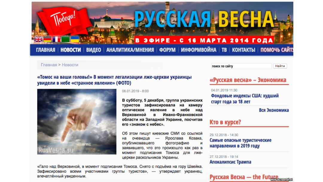 Мистические события освещает прокремлевское издание «Русская весна». В тексте под названием «Томос на ваши головы!» рассказывается о группе украинских туристов, которым удалось зафиксировать «знак с небес» в Ивано-Франковской области.
