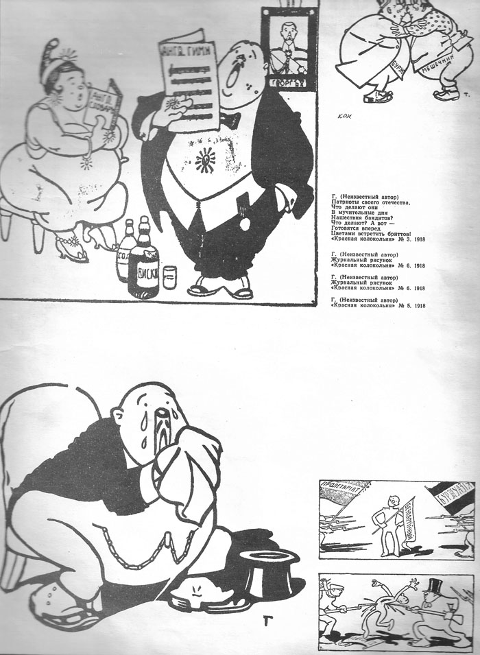 «Буржуев» в журналах рисуют всегда толстыми, в черных костюмах и лаковых цилиндрах. Это, кстати, очень распространенный прием такой был — в иллюстрациях из «Родной речи» 70-х годов с Мальчишом-Кибальчишом воевали вот такие же дядьки во фраках и белых туфлях. Рядом с буржуем изображен также и некий толстый мешечник — которого по задумке авторов журнала тоже должны ненавидеть читатели.