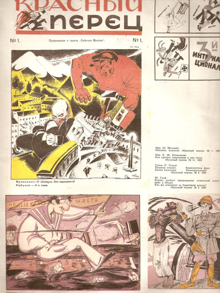 Для начала скажу пару слов о самих изданиях. Развороты страниц, которые я покажу сегодня — принадлежат журналам «Новый сатирикон» и «Красный перец» — это два журнала раннесоветской эпохи. Журналы издавались ещё до переворота 1917 года, но потом как и многое другое в совке — были «национализированы» (отжаты), объявлены советскими и стали гнать оголтелую совдеповскую пропаганду.