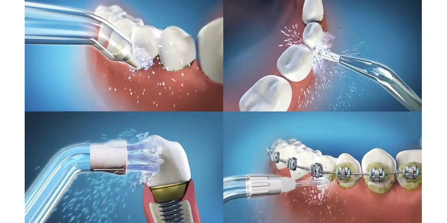Насадки, цель которых – очистить не только участки в полости рта, недоступные для традиционных или электрических зубных щеток, но и удалить бактерии из поддесневых карманов, языка, элементов брекетов, ортодонтические устройства, мосты или имплантаты.